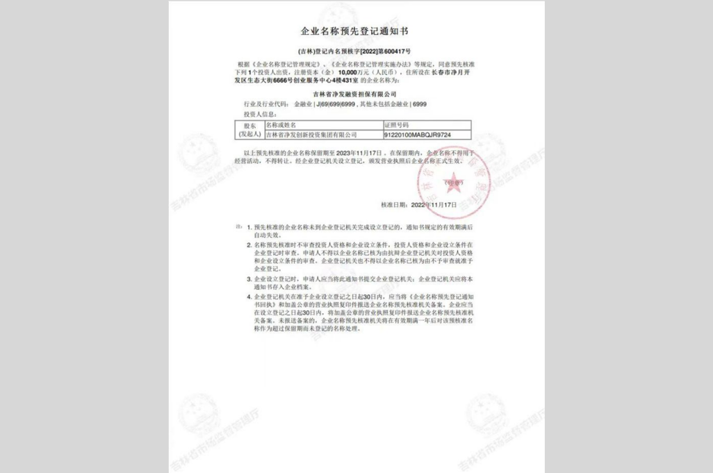 吉林省凈發(fā)融資擔(dān)保有限公司完成預(yù)核名工作。