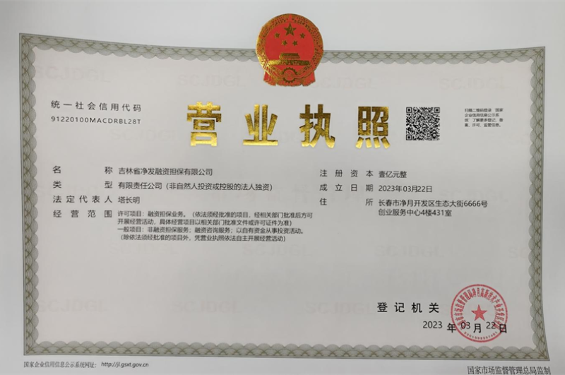 吉林省凈發(fā)融資擔(dān)保有限公司獲批工商營業(yè)執(zhí)照。