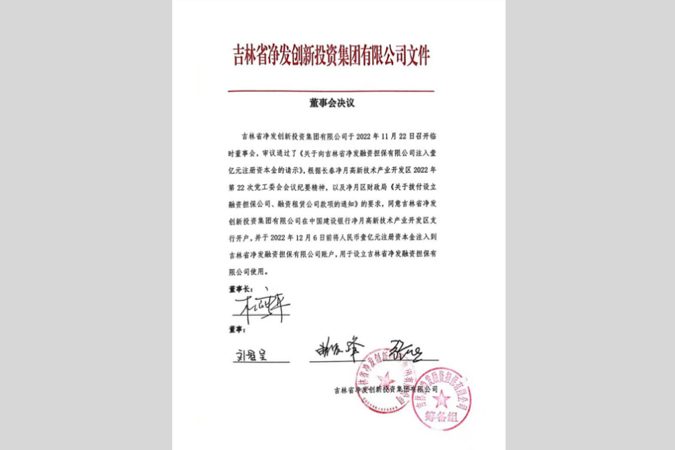 凈發(fā)創(chuàng)新集團(tuán)研究通過關(guān)于融資擔(dān)保公司設(shè)立事項(xiàng),形成決議報(bào)送省金融局。