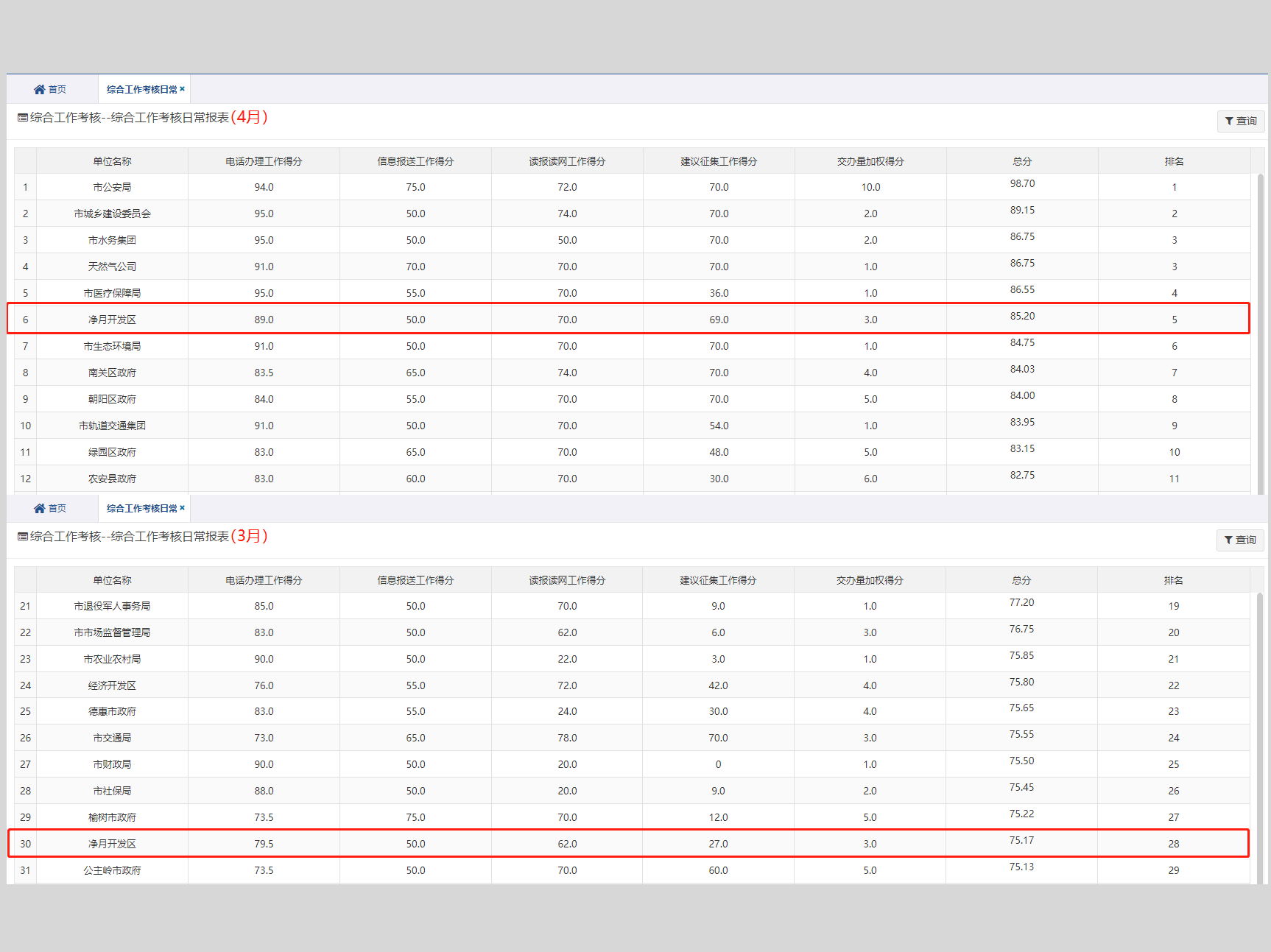在凈月高新區(qū)管委會黨工委的高度重視下,在區(qū)政數(shù)局“一網(wǎng)統(tǒng)管”系統(tǒng)的支持下,在全體作戰(zhàn)單位及鄉(xiāng)鎮(zhèn)、街道積極配合下,我區(qū)市長熱線綜合排名從原來的全市第28名,一躍升至全市第5名。