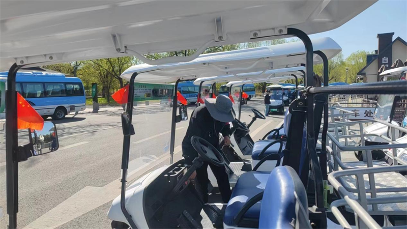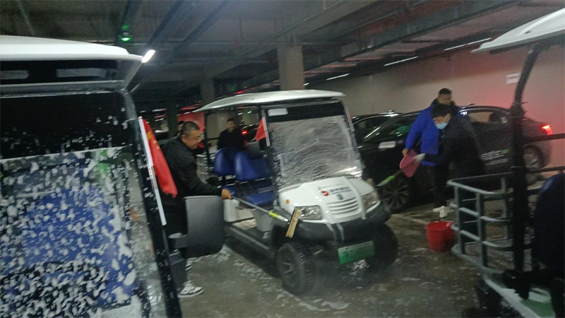 “五一”國際勞動節(jié)游園游客量較多,支部黨員提前做好接待準備。全體黨員來到車庫,沖刷自駕車。期間分工明確,噴水、刷車、擦車有序進行。清潔后的車輛煥然一新,將車輛停放到租賃處附近,為接待游客做好準備。